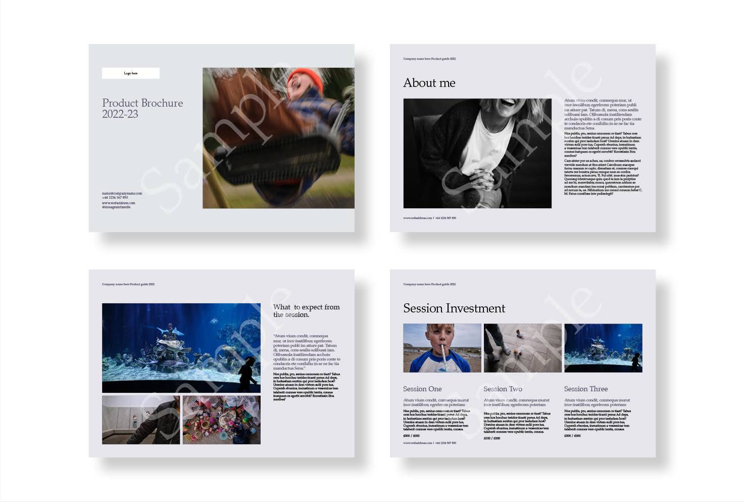 14 different page templates: about, pricing, what to expect, packages, testimonials and more. A free Canva account is required to edit the design.